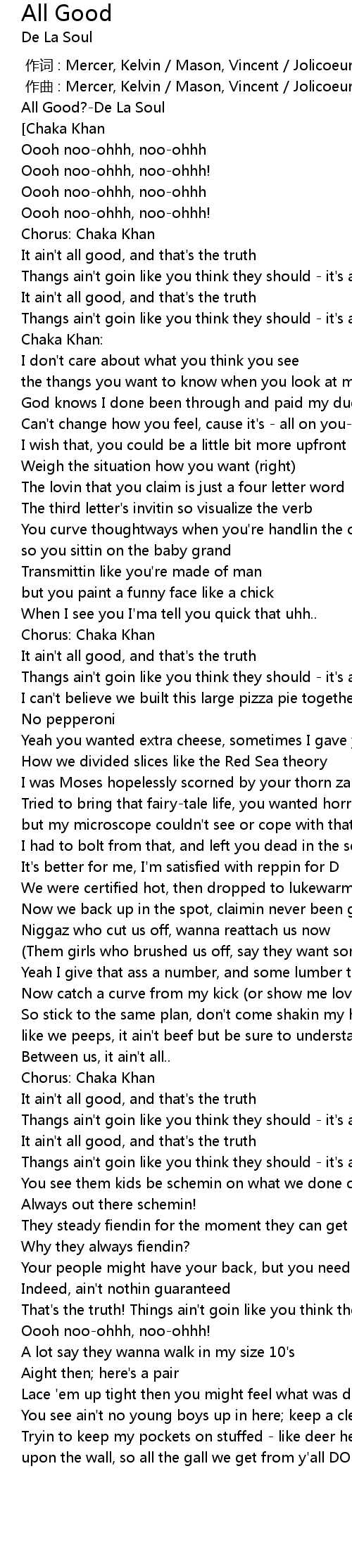 | [00:40.242] | It ain' t all good, and that' s the truth |