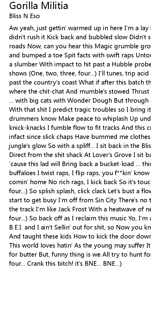 Aw yeah, just gettin' warmed up in here I'm a lay it down like this, yo We didn't rush it Kick back and bubbled slow Didn't suck dick Hit gas and rumbled roads Now, can you hear this Magic grumble grow We move like the drums Tic-tac and bumped a toe Spit facts with swift raps Untouchable with syntax To bitchslap a slumber With impact to hit past a Hubble probe Spin back to fit massive summer shows (One, two, three, four...) I'll tunes, trip acid undertones ... that sit past the country's coast What if after this batch the bubble blows Lord knows where the chit-chat And mumble's stowed Thrust in the ringmaster's Thunderdome ... with big cats with Wonder Dough But through all the mish-mash I wonder, bro With that shit I predict tragic troubles so I bring it back To this patch and drummers know Make peace to whiplash Up under his dome And pitch black with knick-knacks I fumble flow to fit tracks And this cracks the puzzle's code And infact since slick chaps Have bummed me clothes We're trailblazin' a lit path by jungle's glow So with a spliff... I sit back in the Bliss bachelor's bungalow Direct from the shit shack At Lover's Grove I sit back with a six-pack and... 'cause this lad will Bring back a bucket-load ... thick hash And zigzags on buffaloes I twist raps, I flip raps, you f**kin' know So kick back, Big Macka's comin' home No rich rags, I kick back So it's touch and go (One, two, three, four...) So splish splash, click clack Let's bust a flow (Aw yeah...) Yo, when I start to get busy I'm off from Sin City There's no turning back Once Macka's on the track I'm like Jack Frost With a heatwave of new shit (One, two, three, four...) So back off as I reclaim this music Yo, I'm a tell it how it is This is B.E.I. and I ain't Sellin' out for shit, so Now you know who Spits the raw sound And taught these kids How to kick the door down Hours in the air, run for cover This world loves hatin' As the young may suffer It's like there's a Huge hunt for butter But, funny thing is we All try to hunt for cover (One, two, three, four... Crank this bitch! it's BNE... BNE...) |