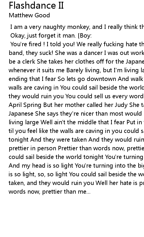 [Monkey:] I am a very naughty monkey, and I really think this band is really shit. Ha ha. I'm naughty. [Matt:] Okay, just forget it man. [Boy:] Alright you slam your band ! [Matt:] You're fired ! I told you! We really fucking hate this band, they suck! She was a dancer I was out work She had a law degree, I used to be a clerk She takes her clothes off for the Japanese I take my clothes off whenever it suits me Barely living, but I'm living large Well it ain't the ending that I fear So lets go downtown And walk around til you feel like the walls are caving in You could sail beside the world tonight They were taken, and they would ruin you You could sell us every words tonight She had a name like April Spring But her mother called her Judy She takes her clothes off for the Japanese She says they're nicer than most would be Barely living, but we're living large Well ain't the middle that I fear Put in the ground And wait arund til you feel like the walls are caving in you could sail beside the world tonight And they were taken And they would ruin you Well her hate is still prettier in person Prettier than words now, prettier than, prettier than me You could sail beside the world tonight You're turning into the biggest it all gets And my head is so light You're turning into the biggest it all gets And my head is so light, so, so light You could sail beside the world tonight And they were taken, and they would ruin you Well her hate is prettier in person Prettier than words now, prettier than me... |