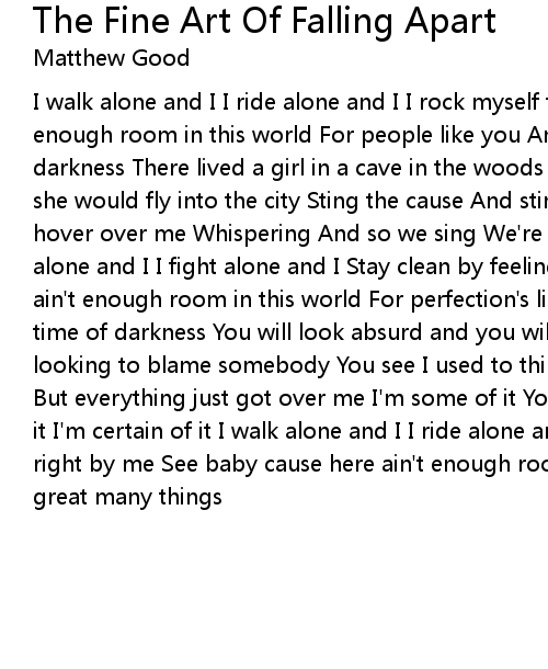 I walk alone and I I ride alone and I I rock myself to sleep Baby, there ain't enough room in this world For people like you And horrors like me A time of darkness There lived a girl in a cave in the woods Disguised as a bee At night she would fly into the city Sting the cause And sting the cost And she would hover over me Whispering And so we sing We're surfacing We're surfacing I stand alone and I I fight alone and I Stay clean by feeling cheap And baby, there ain't enough room in this world For perfection's like you And monsters like me A time of darkness You will look absurd and you will feel inert And you will go looking to blame somebody You see I used to think that I'd get over everything But everything just got over me I'm some of it You're some of it We're some of it I'm certain of it I walk alone and I I ride alone and you know That's all right by me See baby cause here ain't enough room in this world For a great, great many things |
