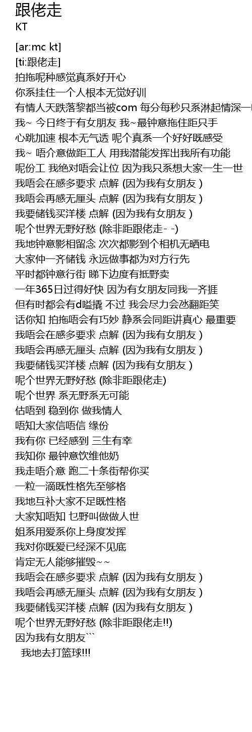 | [02:44.69] | 呢个世界无野好愁 (除非距跟佬走!!) 因为我有女朋友``` |