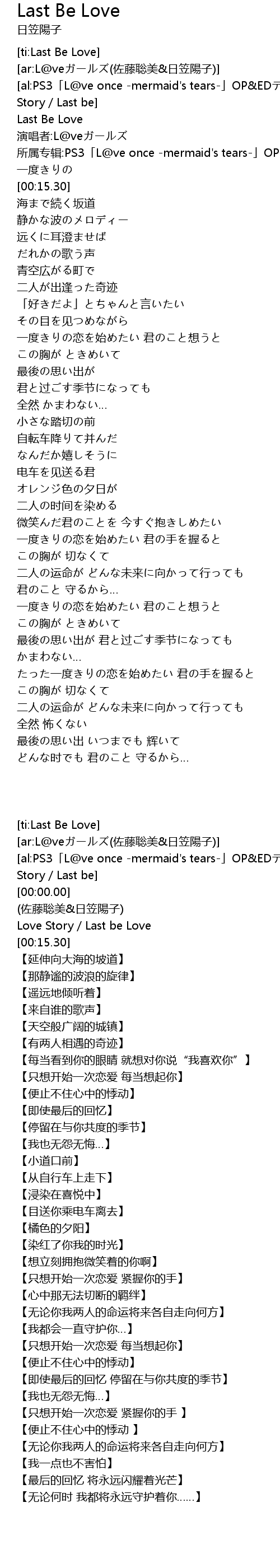 | [al:PS3「L@ve once -mermaid's tears-」OP&EDテーマ - 一度きりのLove Story/Last be] | |