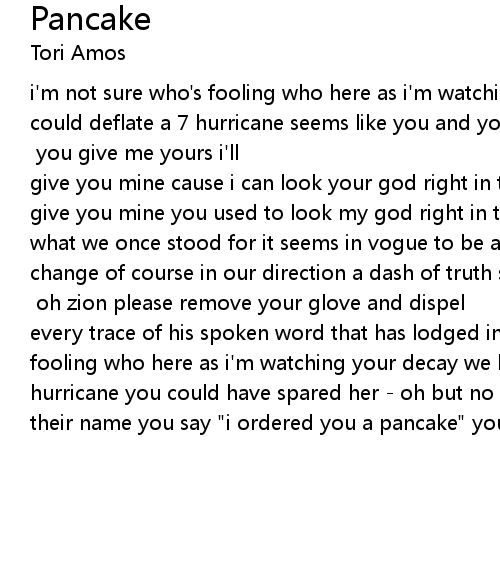 i'm not sure who's fooling who here as i'm watching your decay we both know you could deflate a 7 hurricane seems like you and your tribe decided you'd rewrite the law segregate the mind from body and soul [CHORUS:] you give me yours i'll give you mine cause i can look your god right in the eye you give me yours i'll give you mine you used to look my god right in the eye i believe in defending in what we once stood for it seems in vogue to be a closet misogynist homophobe a change of course in our direction a dash of truth spread thinly like a flag on a popstar on a benzodiazapene [CHORUS] oh zion please remove your glove and dispel every trace of his spoken word that has lodged in my vortex i'm not sure who's fooling who here as i'm watching your decay we both know you could deflate a 7 hurricane you could have spared her - oh but no messiahs need people dying in their name you say "i ordered you a pancake" you say "i ordered you a pancake"