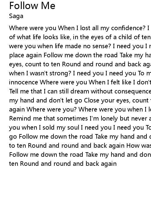 Where were you When I lost all my confidence? I need you I need you To remind me of what life looks like, in the eyes of a child of ten Where were you? Where were you when life made no sense? I need you I need you Help me return to that place again Follow me down the road Take my hand and don't let go Close your eyes, count to ten Round and round and back again Where were you? Where were you when I wasn't strong? I need you I need you To make me believe in the magic of innocence Where were you When I felt like I don't belong I need you I need you Tell me that I can still dream without consequence Follow me down the road Take my hand and don't let go Close your eyes, count to ten Round and round and back again Where were you? Where were you when I lost control? I need you I need you Remind me that sometimes I'm lonely but never alone Where were you? Where were you when I sold my soul I need you I need you To hold me so tight, and never let go Follow me down the road Take my hand and don't let go Close your eyes, count to ten Round and round and back again How was I to know You'd be letting go Follow me down the road Take my hand and don't let go Close your eyes, count to ten Round and round and back again |