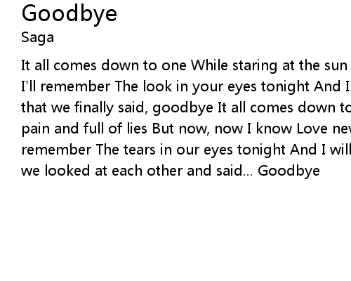 | It all comes down to one While staring at the sun It all comes down to one One I'll remember The look in your eyes tonight And I will always remember The day that we finally said, goodbye It all comes down to one Just one heart Full of pain and full of lies But now, now I know Love never dies And I will always remember The tears in our eyes tonight And I will always remember The day that we looked at each other and said... Goodbye |