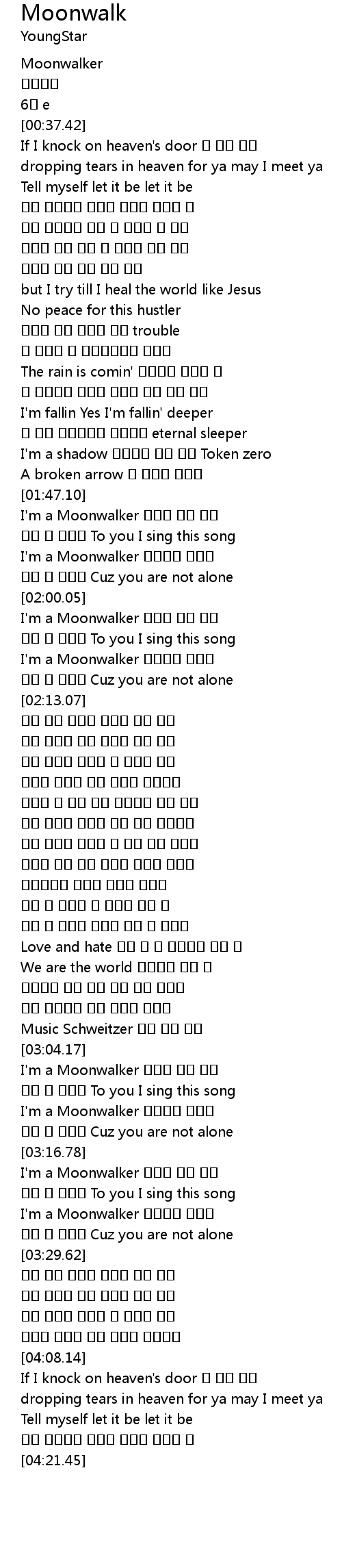 | [03:23.38] | I'm a Moonwalker 세상에게 쫓기는 |