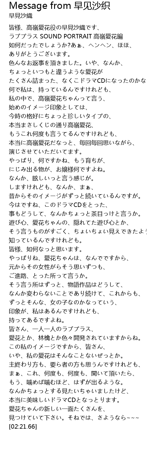 | [00:00.16] | 皆様、高嶺愛花役の早見沙織です、 |