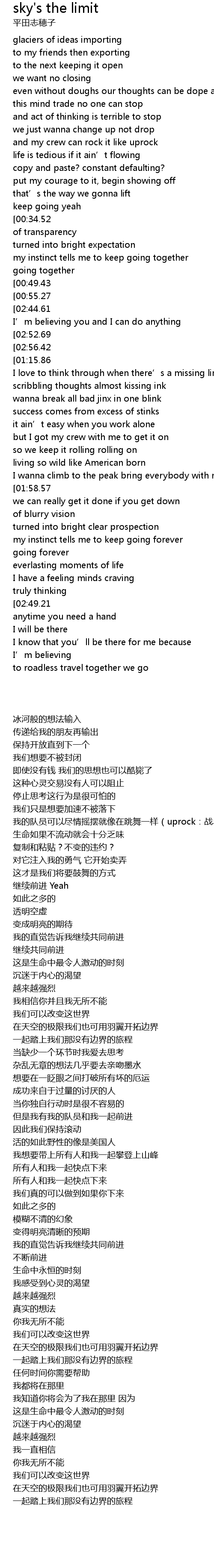 | [03:41.57][02:56.42][01:11.48] | hey sky' s the limit we can spread wings |