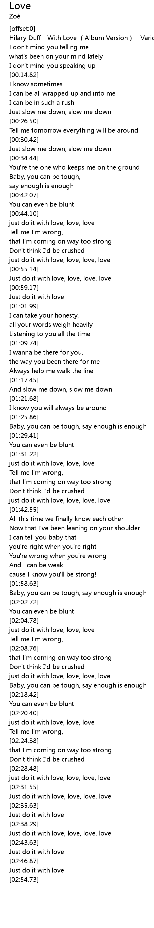 | [00:00.69] | Hilary Duff - With Love (Album Version) - Various Artists |