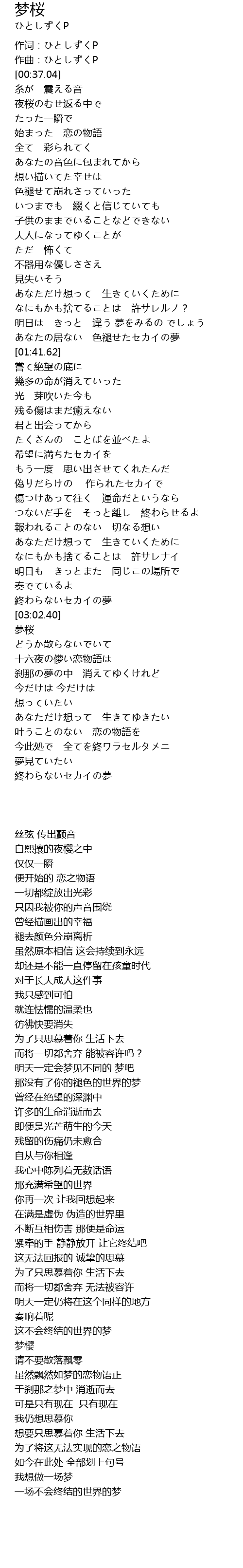 | [01:36.78] | あなたの居ない 色褪せたセカイの夢 |