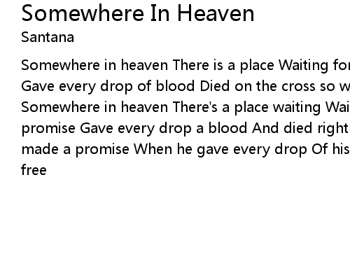 | Somewhere in heaven There is a place Waiting for you and me He made a promise Gave every drop of blood Died on the cross so we'd be free Oh Oh Oh Oh Somewhere Somewhere in heaven There's a place waiting Waiting for you and me He made a promise Gave every drop a blood And died right on the cross So we'd be free He made a promise When he gave every drop Of his blood Died on the cross So we'd be free |
