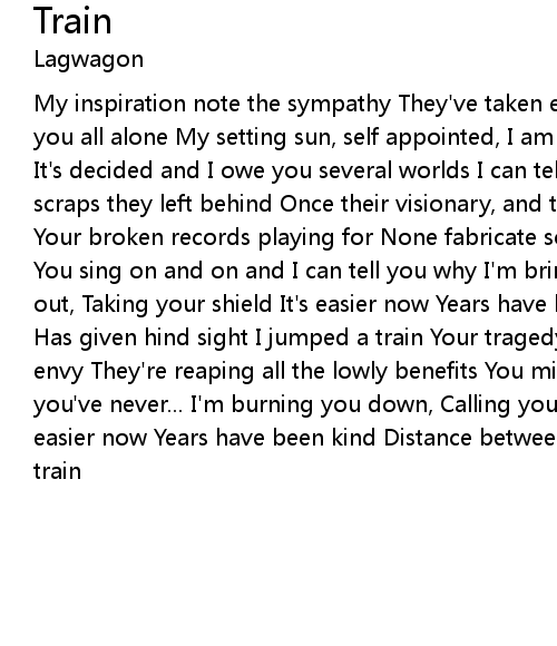 My inspiration note the sympathy They've taken everything you want and they left you all alone My setting sun, self appointed, I am a fraud You are the martyr It's decided and I owe you several worlds I can tell you... Rat in the sewer, scraps they left behind Once their visionary, and they all have robbed you blind Your broken records playing for None fabricate song Amputated creative tongue You sing on and on and I can tell you why I'm bringing you down, Calling you out, Taking your shield It's easier now Years have been kind Distance between Has given hind sight I jumped a train Your tragedy so easy to read, Is bitter envy They're reaping all the lowly benefits You missed the train they stole And you've never... I'm burning you down, Calling you out, Taking your shield It's easier now Years have been kind Distance between has given hind sight I'm on a train |