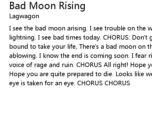 I see the bad moon arising. I see trouble on the way. I see earthquakes and lightning. I see bad times today. CHORUS: Don't go around tonight, Well, it's bound to take your life, There's a bad moon on the rise. I hear hurricanes ablowing. I know the end is coming soon. I fear rivers over flowing. I hear the voice of rage and ruin. CHORUS All right! Hope you got your things together. Hope you are quite prepared to die. Looks like we're in for nasty weather. One eye is taken for an eye. CHORUS CHORUS