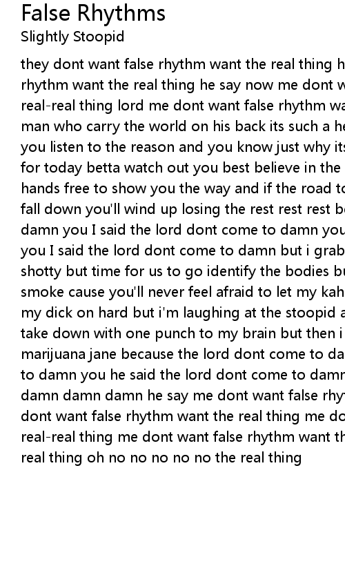 they dont want false rhythm want the real thing he say now me dont want false rhythm want the real thing he say now me dont want false rhythm want the real-real thing lord me dont want false rhythm want the real thing he say now me man who carry the world on his back its such a heavy but a price to pay but then you listen to the reason and you know just why its hustle bustle that you live for today betta watch out you best believe in the righteous man who puts his hands free to show you the way and if the road to life yes its goin up but dont fall down you'll wind up losing the rest rest rest because the lord dont come to damn you I said the lord dont come to damn you I said the lord dont come to damn you I said the lord dont come to damn but i grabbed my nine and kyle grabbed the shotty but time for us to go identify the bodies buckshots got you ass up in smoke cause you'll never feel afraid to let my kahkis hang real low strap with my dick on hard but i'm laughing at the stoopid ass security guard who tried to take down with one punch to my brain but then i tell them that i only smoke the marijuana jane because the lord dont come to damn you I said the lord dont come to damn you he said the lord dont come to damn you because the lord dont come to damn damn damn he say me dont want false rhythm want the real thing (whoa oh) me dont want false rhythm want the real thing me dont want false rhythm want the real-real thing me dont want false rhythm want the real real real real on no the real thing oh no no no no no the real thing |