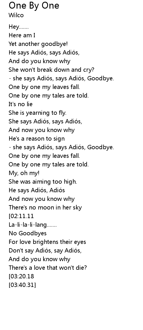 | [01:25.18] | - she says Adiós, says Adiós, Goodbye. |