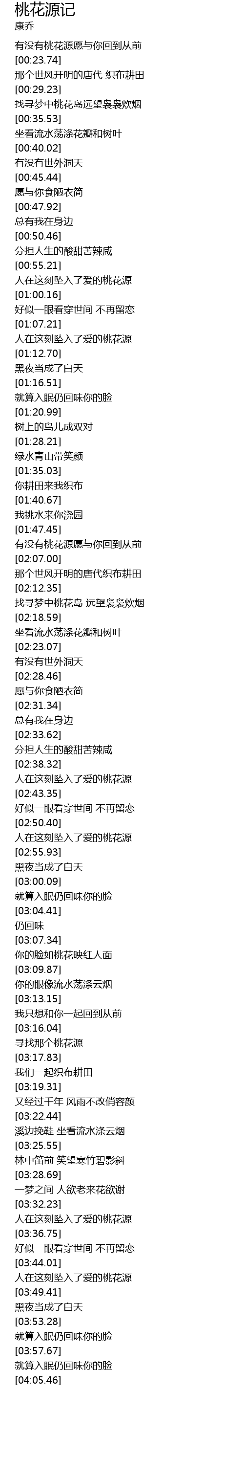 | [00:18.49] | yǒu méi yǒu táo huā yuán yuàn yǔ nǐ huí dào cóng qián |