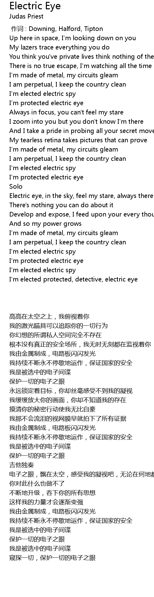 | [01:41.055] | Electric eye, in the sky, feel my stare, always there |