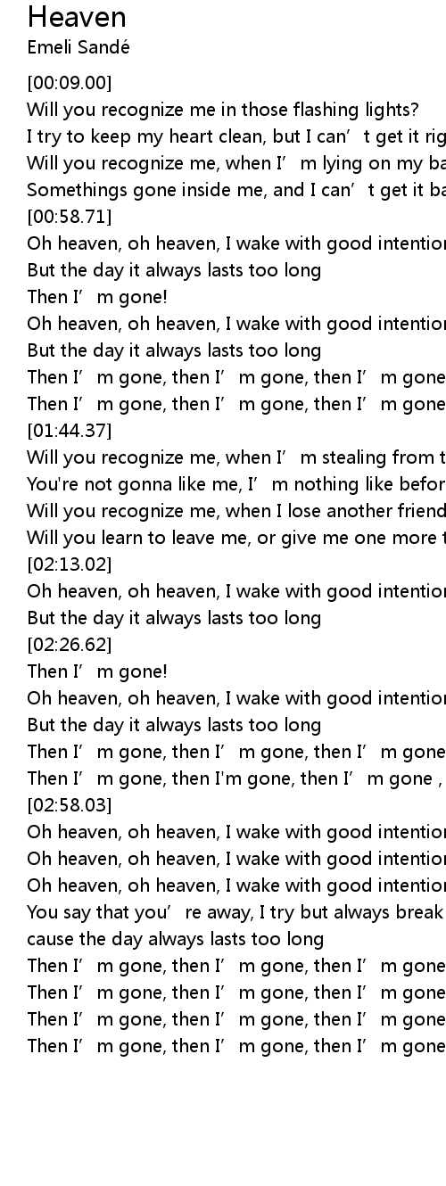| [02:59.12] | Oh heaven, oh heaven, I wake with good intentions, |