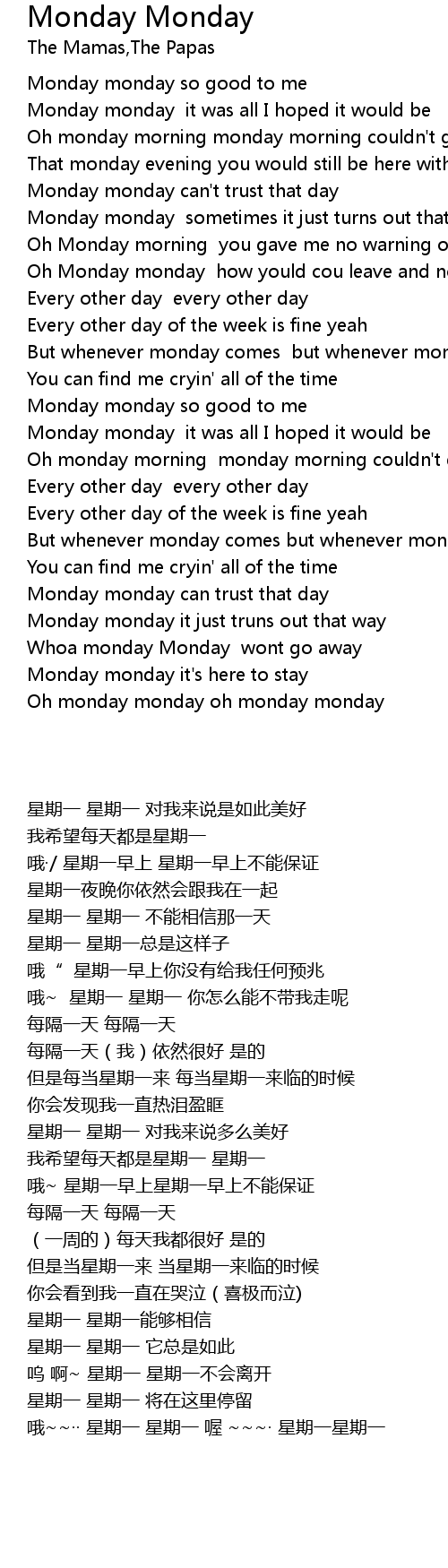 | [02:54.87] | Whoa monday Monday wont go away |