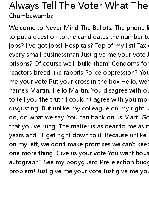 Welcome to Never Mind The Ballots. The phone lines are now open. If you'd like to put a question to the candidates the number to ring is 0532779463. You want jobs? I've got jobs! Hospitals? Top of my list! Tax cuts and platform shoes For every small businessman Just give me your vote Just give me your vote Schools, prisons? Of course we'll build them! Condoms for the American GIs! Nuclear reactors breed like rabbits Police oppression? You can have it, sir! Just give me your vote Put your cross in the box Hello, we've got our first caller. You're name's Martin. Hello Martin. You disagree with our statement policy. Well Martin to tell you the truth I couldn't agree with you more. It's outrageous, disgusting. But unlike my colleague on my right, we're the party who say what we do, do what we say. You can bank on us Mart! Good evening, Shirley. I'm so glad that you've rung. The matter is as dear to me as it is to you. Give me four years and I'll get right down to it. Because unlike my little balding colleague on my left, we don't make promises we can't keep. You still there, Martin? Just one more thing. Give us your vote You want houses? See me afterwards Want my autograph? See my bodyguard Pre-election budget handouts You want a war? No problem! Just give me your vote Just give me your vote |