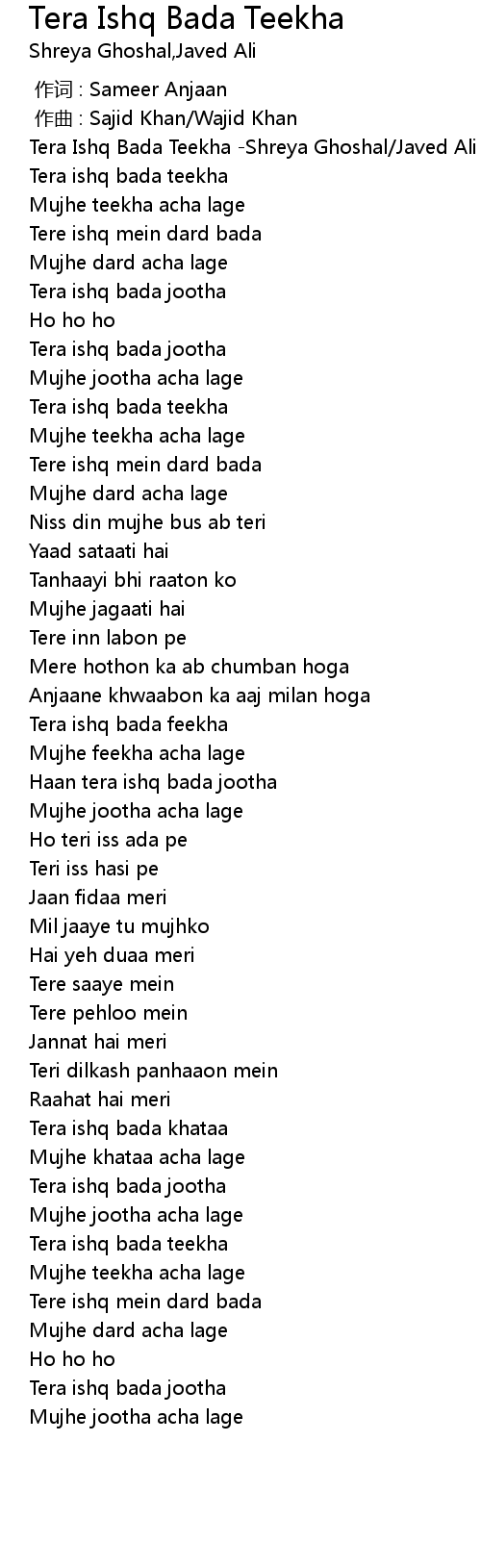 | [00:00.724] | Tera Ishq Bada Teekha Shreya Ghoshal Javed Ali |