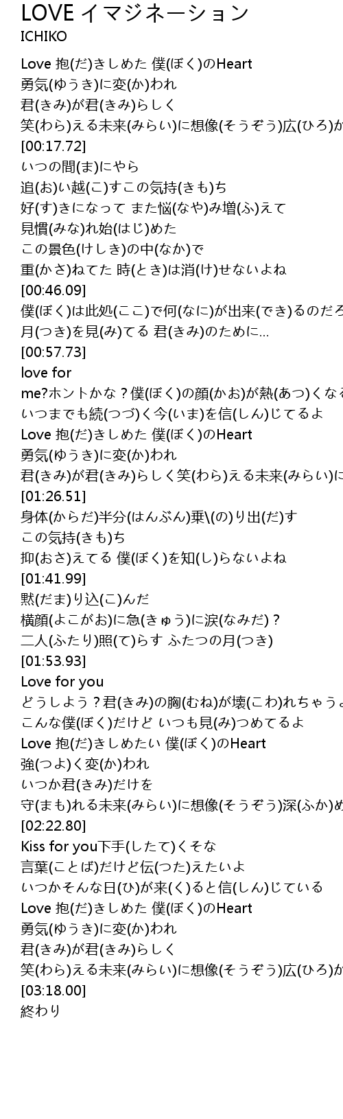 | [00:03.16] | Love 抱(だ)きしめた 僕(ぼく)のHeart 勇気(ゆうき)に変(か)われ |