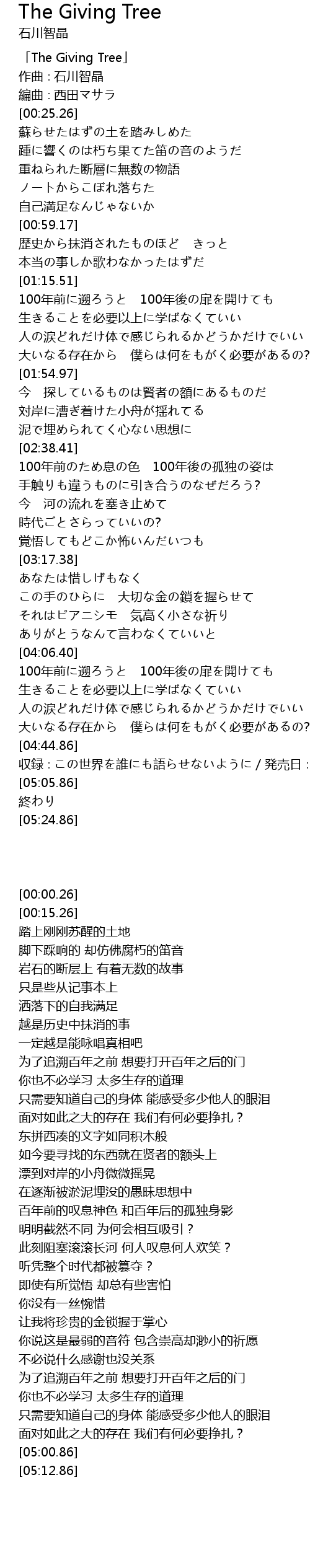 | [02:42.73] | 100年前のため息の色 100年後の孤独の姿は |