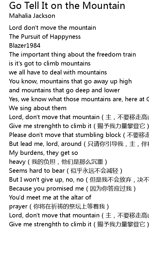 | [01:16.00] | Lord, don' t move that mountain zhu, bu yao yi zou gao shan |