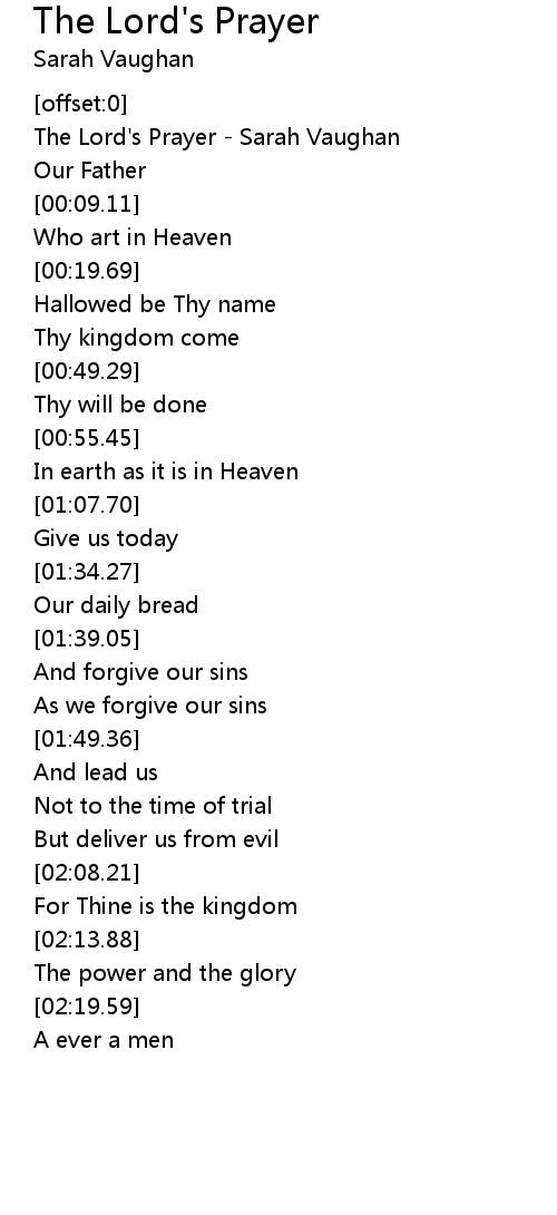 | [00:01.18] | The Lord's Prayer - Sarah Vaughan |