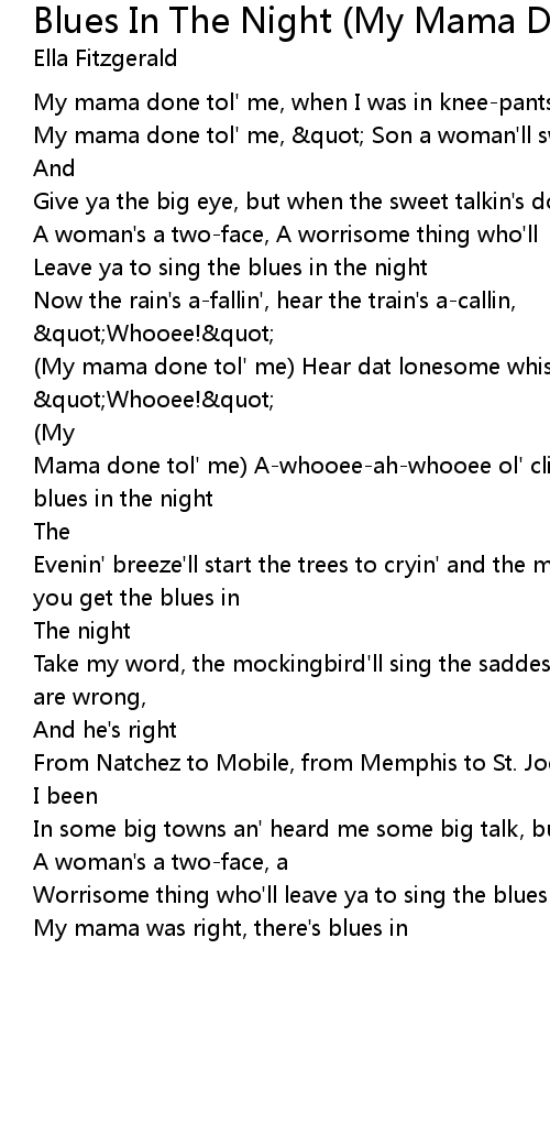 Mama done tol' me) A-whooee-ah-whooee ol' clickety-clack's a-echoin' back th' blues in the night |