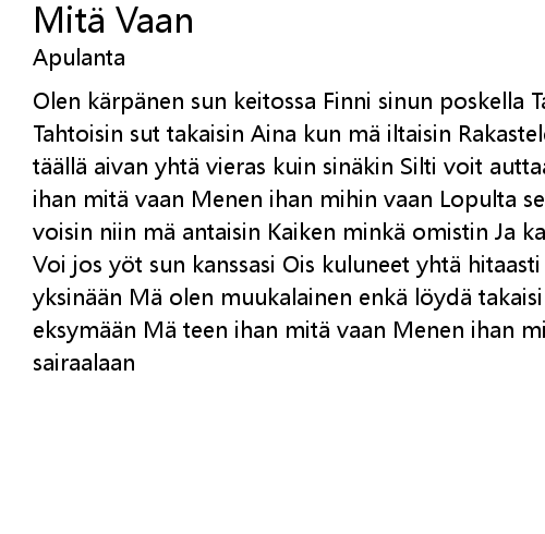 | Olen k rp nen sun keitossa Finni sinun poskella Tauti jonka pystyy hoitamaan Tahtoisin sut takaisin Aina kun m iltaisin Rakastelen muistoos yksin n Olen t ll aivan yht vieras kuin sin kin Silti voit auttaa eksym n M teen ihan mit vaan Menen ihan mihin vaan Lopulta se vie mut sairaalaan Jos m voisin niin m antaisin Kaiken mink omistin Ja kaiken mist kerran haaveilin Voi jos y t sun kanssasi Ois kuluneet yht hitaasti Kuin n m jotka viet n yksin n M olen muukalainen enk l yd takaisin Sin kin voit auttaa eksym n M teen ihan mit vaan Menen ihan mihin vaan Lopulta se vie mut sairaalaan |