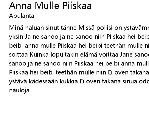 | Min haluan sinut t nne Miss poliisi on yst v mme Ja ne sanoo sin et ole yksin Ja ne sanoo ja ne sanoo niin Piiskaa hei beibi anna mulle Piiskaa hei beibi anna mulle Piiskaa hei beibi teeth n mulle niin Sit samaa minun radio soittaa Kuinka lopultakin el m voittaa Jane sanoo sin olet kauhein Ja ne sanoo ja ne sanoo niin Piiskaa hei beibi anna mulle Piiskaa hei beibi anna mulle Piiskaa hei beibi teeth n mulle niin Ei oven takana sinua odota Iloinen yst v k dess n kukkia Ei oven takana sinua odota L mmint syli ilman nauloja |