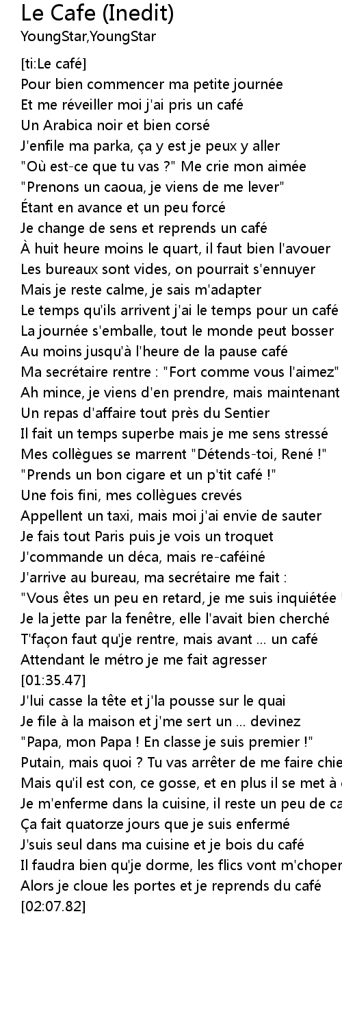 | [00:33.14] | Le temps qu' ils arrivent j' ai le temps pour un cafe |