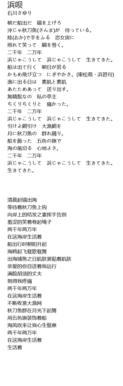 | [04:10.20] | 浜じゃこうして 浜じゃこうして 生きてきた。 |