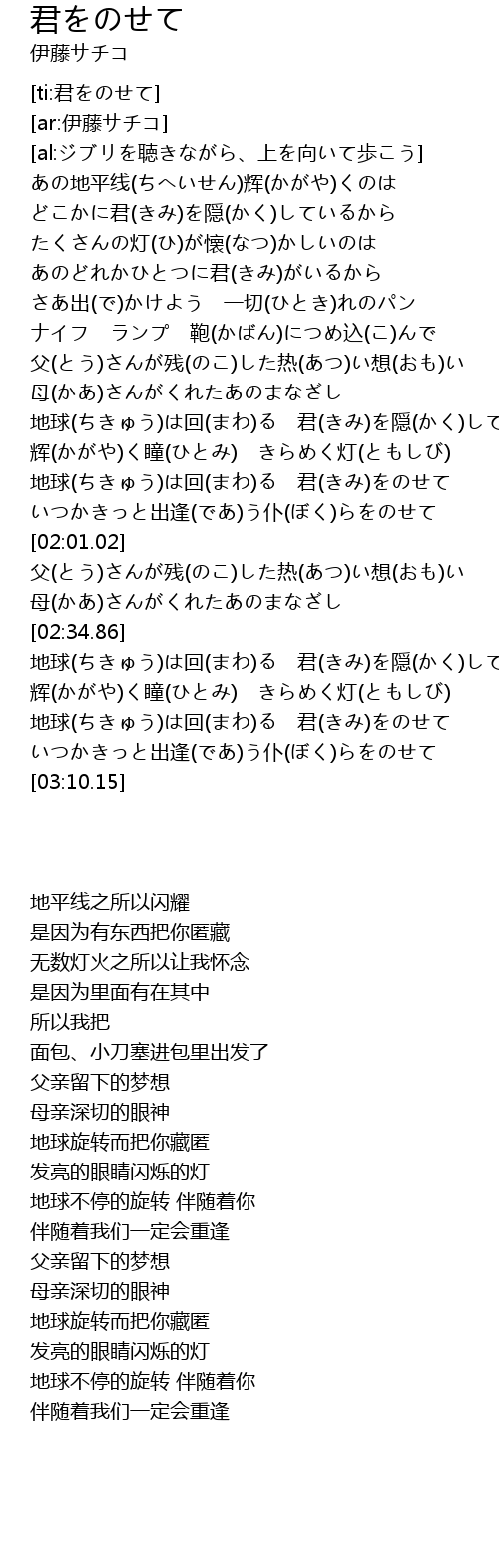 | [03:00.94] | いつかきっと出逢(であ)う仆(ぼく)らをのせて |
