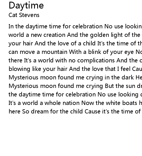 In the daytime time for celebration No use looking down if it's over here It's a world a new creation And the golden light of the morning Makes it easy to comb your hair And the love of a child It's the time of the year In the daytime you can move a mountain With a blink of your eye Now it's over here now it's over there It's a world with no complications And the curtains on the window Start blowing like your hair And the love that I feel Cause it's the time of the year Mysterious moon found me crying in the dark Heard my footsteps on the stairs Mysterious moon found me crying But the sun dried my tears Showed he cares In the daytime time for celebration No use looking down children open your eyes It's a world a whole nation Now the white boats have landed And the innocent are here So dream for the child Cause it's the time of the year |