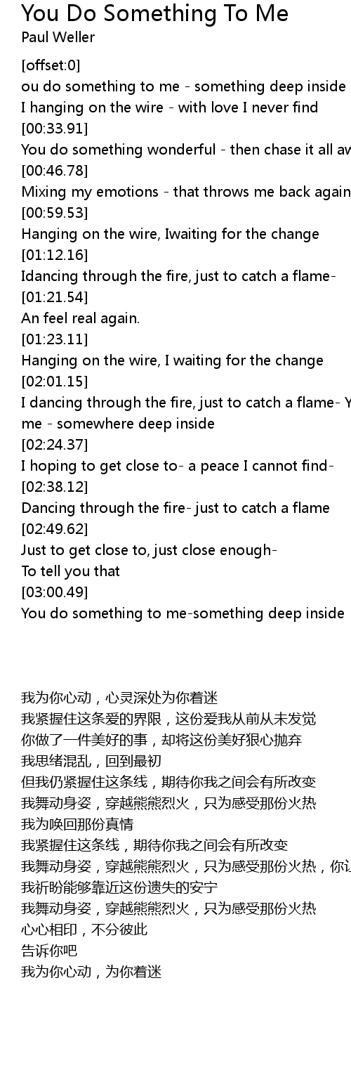 I dancing through the fire, just to catch a flame- You do something to me - somewhere deep inside |