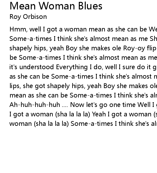 Hmm, well I got a woman mean as she can be Well I got a woman mean as she can be Some-a-times I think she's almost mean as me She gotta ruby lips, she got shapely hips, yeah Boy she makes ole Roy-oy flip I got a woman mean as she can be Some-a-times I think she's almost mean as me Well I ain't braggin', be sure it's understood Everything I do, well I sure do it good Yeah I got a woman mean as she can be Some-a-times I think she's almost mean as me Well! She gotta ruby lips, she got shapely hips, yeah Boy she makes ole Roy-oy flip I got a woman mean as she can be Some-a-times I think she's almost mean as me, easy now Ah-huh-huh-huh .... Now let's go one time Well I got a woman (sha la la la) Yeah I got a woman (sha la la la) Yeah I got a woman (sha la la la) Well I got a woman (sha la la la) Some-a-times I think she's almost mean as me |