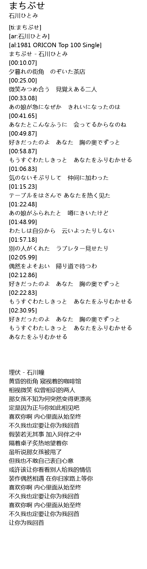 | [00:01.43] | まちぶせ - 石川ひとみ |