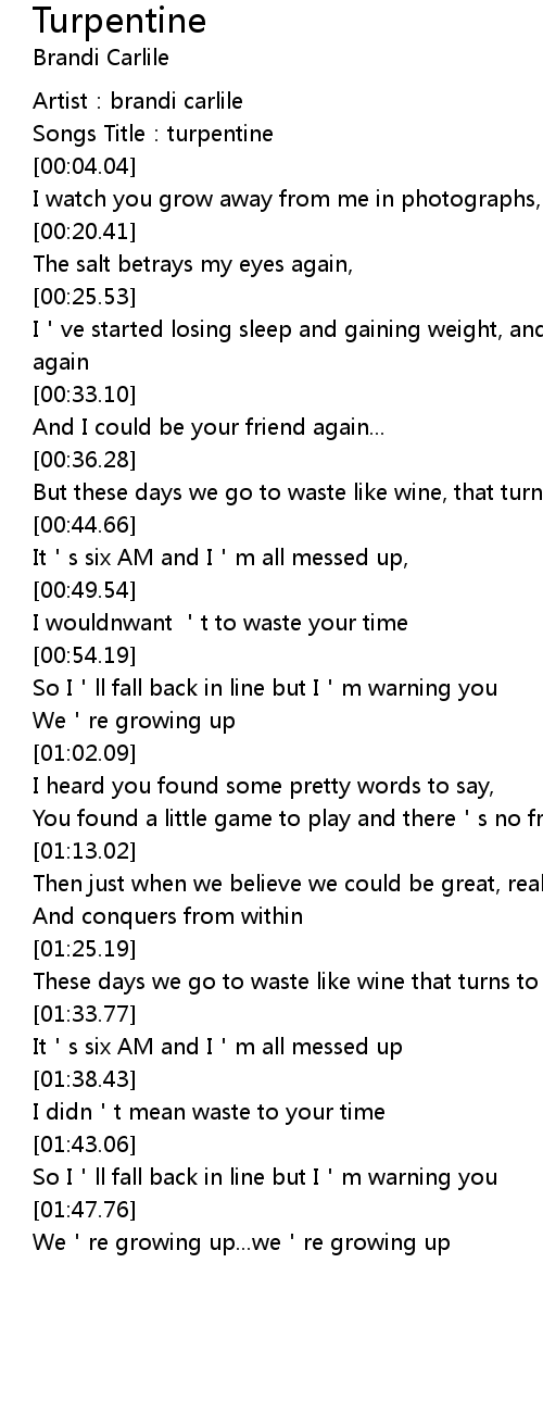 | [01:27.64] | These days we go to waste like wine that turns to turpentine |