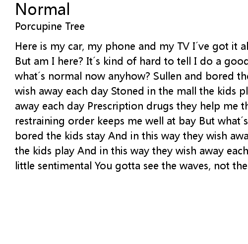 | Here is my car, my phone and my TV I´ve got it all but you can see through me But am I here? It´s kind of hard to tell I do a good impression of myself But what´s normal now anyhow? Sullen and bored the kids stay And in this way they wish away each day Stoned in the mall the kids play And in this way they wish away each day Prescription drugs they help me through the day And that restraining order keeps me well at bay But what´s normal now anyway? Sullen and bored the kids stay And in this way they wish away each day Stoned in the mall the kids play And in this way they wish away each day Wish I was old and a little sentimental You gotta see the waves, not the wine bottle |