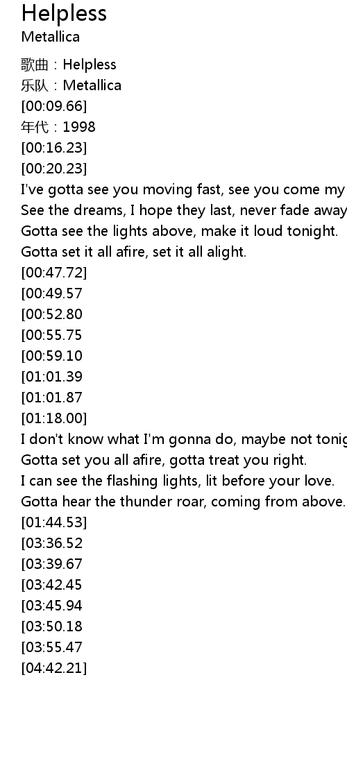 | [01:57.64][01:01.87] | Helpless, helpless, helpless, helpless. |