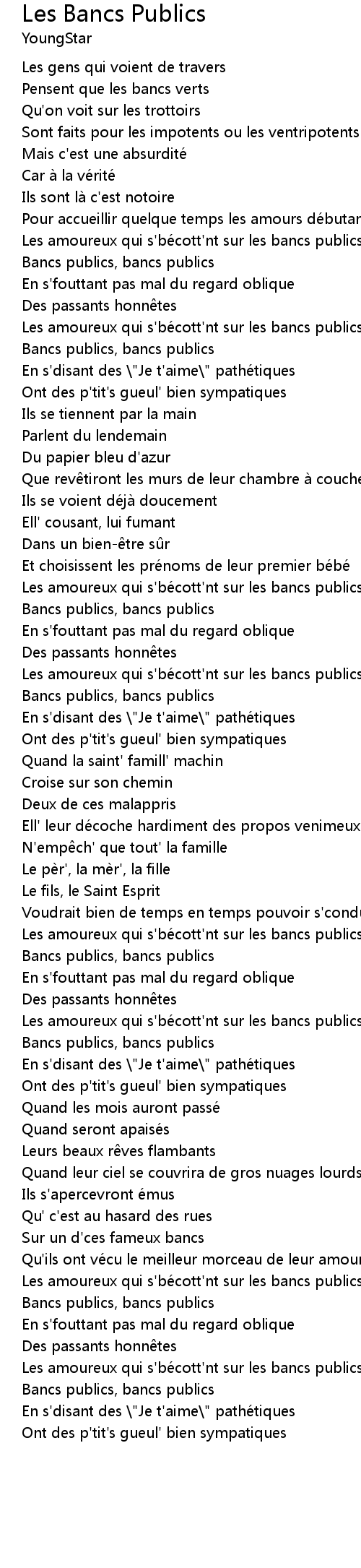 | Les amoureux qui s' be cott' nt sur les bancs publics | |