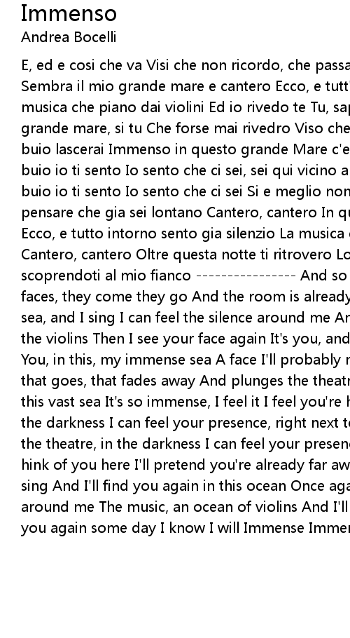 E, ed e cosi che va Visi che non ricordo, che passano E la sala buia e gia Sembra il mio grande mare e cantero Ecco, e tutt'intorno sento gia silenzio La musica che piano dai violini Ed io rivedo te Tu, sapere dove sei In questo grande mare, si tu Che forse mai rivedro Viso che passa e va Questo teatro al buio lascerai Immenso in questo grande Mare c'e l'immenso In questo teatro al buio io ti sento Io sento che ci sei, sei qui vicino a me In questo teatro al buio io ti sento Io sento che ci sei Si e meglio non pensarti qui vicino Meglio pensare che gia sei lontano Cantero, cantero In questo oceano si, ti ritrovero Ecco, e tutto intorno sento gia silenzio La musica e un oceano di violini Cantero, cantero Oltre questa notte ti ritrovero Lo so Immenso Immenso scoprendoti al mio fianco ---------------- And so the story goes Forgettable faces, they come they go And the room is already dark This is my sea, my immense sea, and I sing I can feel the silence around me And the music rises softly from the violins Then I see your face again It's you, and I'm guessing where you are You, in this, my immense sea A face I'll probably never see again That comes, that goes, that fades away And plunges the theatre back into darkness Immense in this vast sea It's so immense, I feel it I feel you're here, in the theatre, in the darkness I can feel your presence, right next to me I feel you're here, in the theatre, in the darkness I can feel your presence Yes, it's wiser not tot hink of you here I'll pretend you're already far away Then I'll sing and I'll sing And I'll find you again in this ocean Once again I'll feel the silence around me The music, an ocean of violins And I'll sing and I'll sing I'll meet you again some day I know I will Immense Immense is knowing you're beside me |