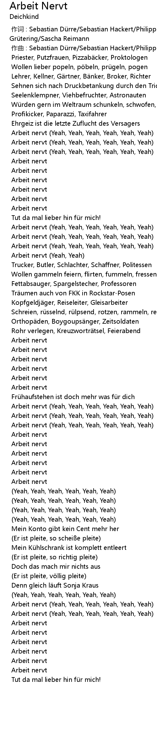 | [00:35.39] | Arbeit nervt (Yeah, Yeah, Yeah, Yeah, Yeah, Yeah) |