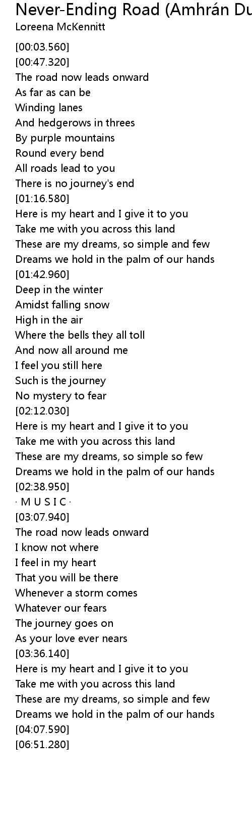 | [00:50.620] | The road now leads onward |