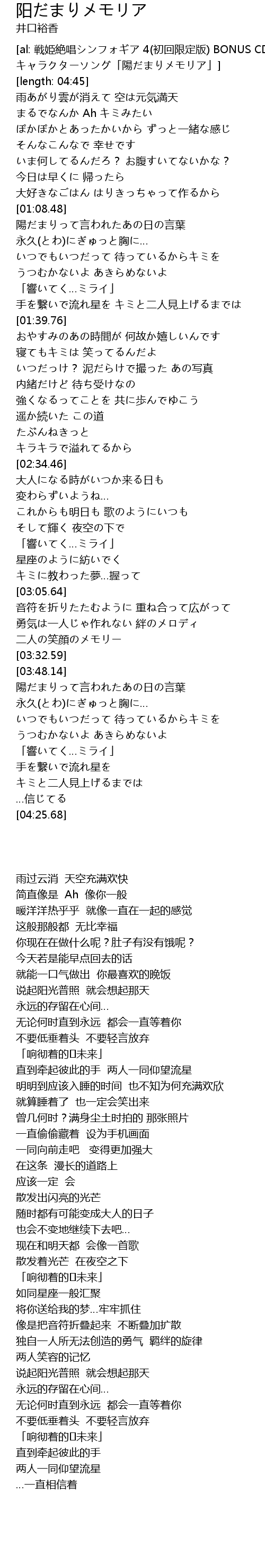 | [04:04.87] | うつむかないよ あきらめないよ |
