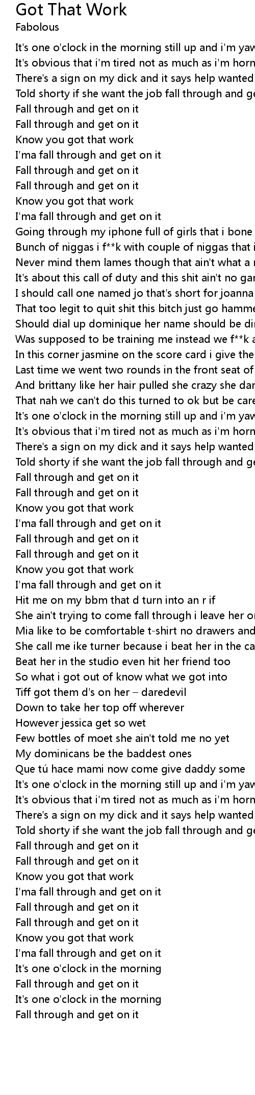 | [02:33.28] | Told shorty if she want the job fall through and get on it |