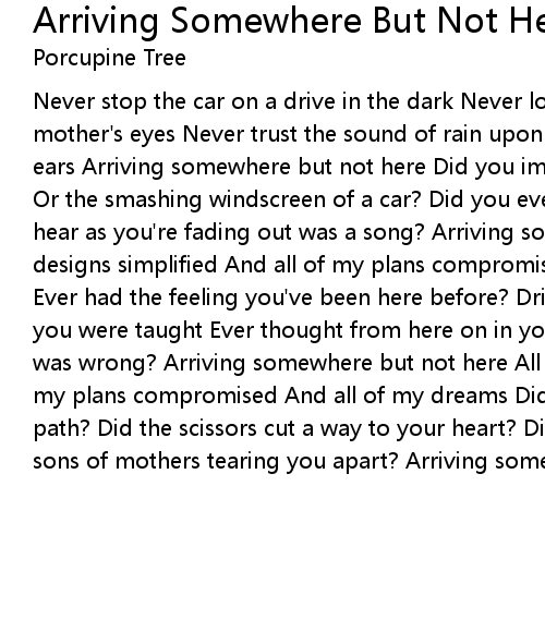 Never stop the car on a drive in the dark Never look for the truth in your mother's eyes Never trust the sound of rain upon a river rushing through your ears Arriving somewhere but not here Did you imagine the final sound as a gun? Or the smashing windscreen of a car? Did you ever imagine the last thing you'd hear as you're fading out was a song? Arriving somewhere but not here All my designs simplified And all of my plans compromised All of my dreams sacrificed Ever had the feeling you've been here before? Drinking down the poison the way you were taught Ever thought from here on in your life begins and all you knew was wrong? Arriving somewhere but not here All my designs simplified And all of my plans compromised And all of my dreams Did you see the red mist block your path? Did the scissors cut a way to your heart? Did you feel the envy for the sons of mothers tearing you apart? Arriving somewhere but not here |