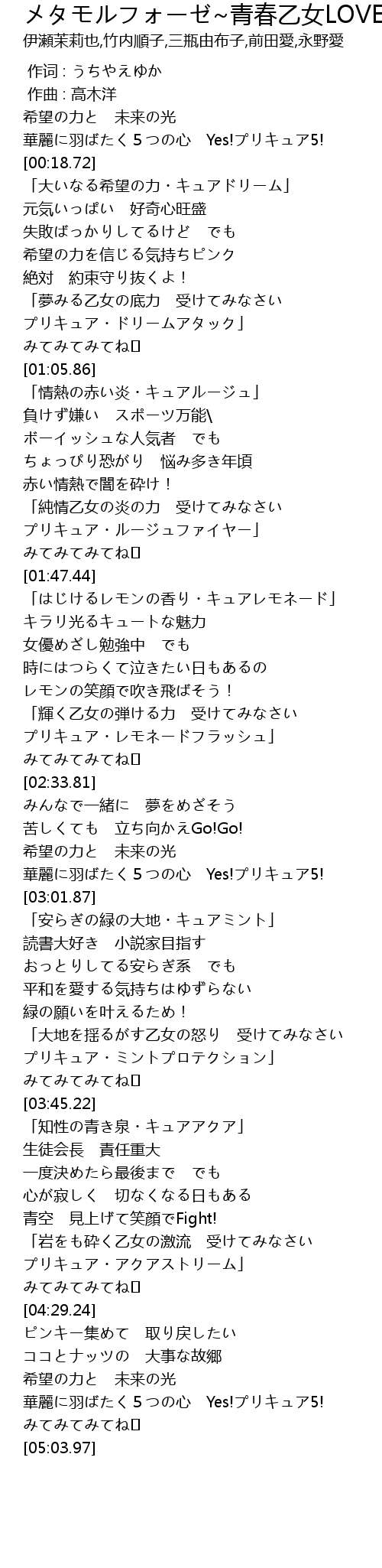| [00:09.59] | 華麗に羽ばたく5つの心 Yes!プリキュア5! |